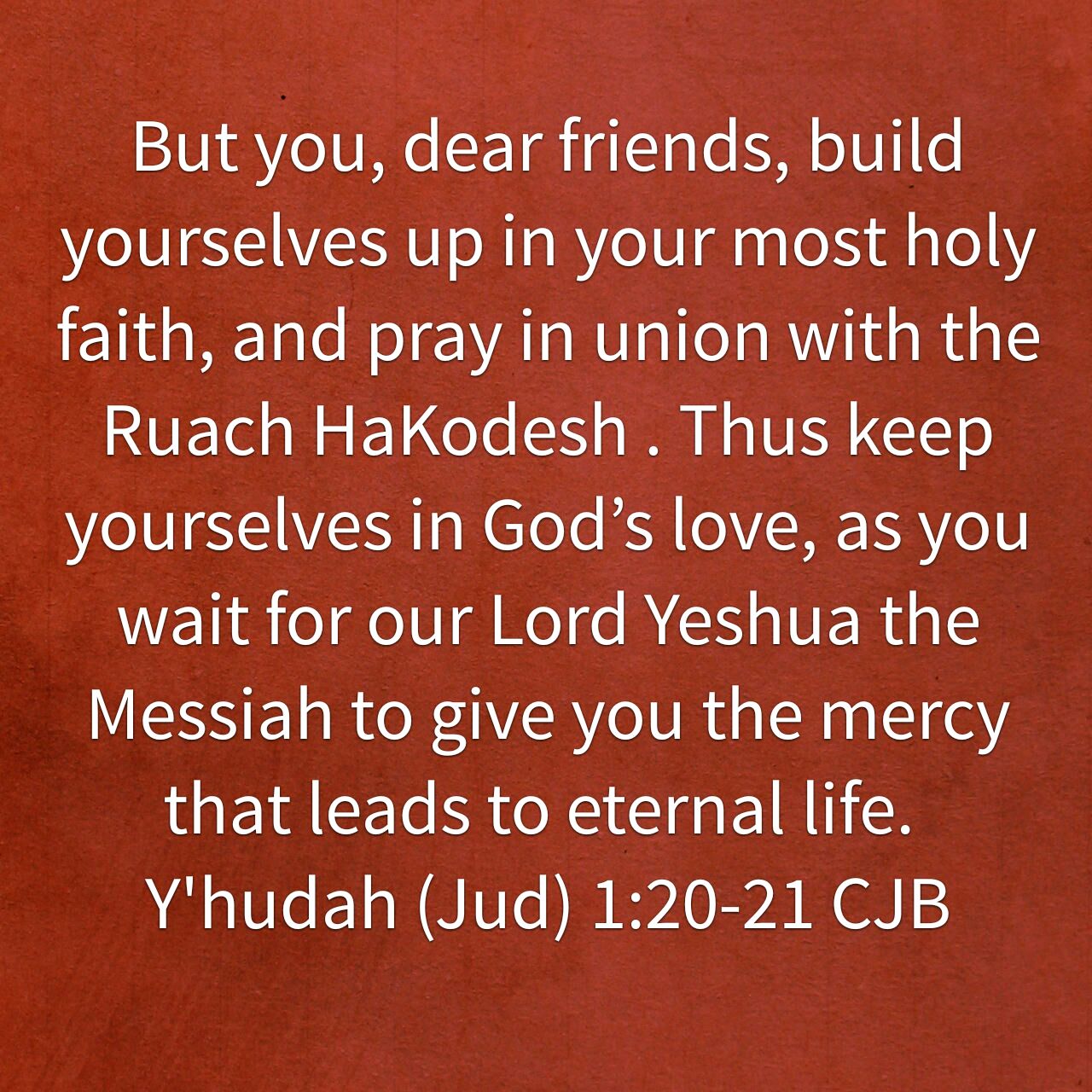 But you, dear friends, build yourselves up in your most holy faith, and pray in union with the Ruach HaKodesh . Thus keep yourselves in God’s love, as you wait for our Lord Yeshua the Messiah to give you the mercy that leads to eternal life.